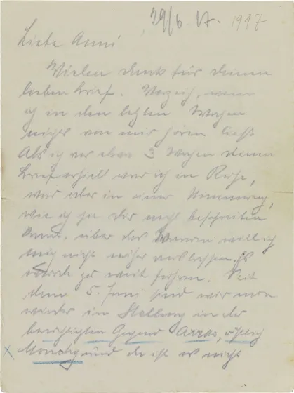 Vom 29. Juni 1917 datiert der einzige erhaltene Feldpostbrief von Arthur Polack, der zu diesem Zeitpunkt bei Arras in Nordfrankreich in Stellung war. In diesem Brief gewährte er, an der Militärzensur vorbei, einer Cousine Einblicke in seine Gedanken und Gefühle. Von Heldenmut und Vaterlandsstolz keine Spur: Er schilderte, wie ihn der Tod seines Schwagers erschütterte, der kurz zuvor gefallen war. In seiner Trauer fühlte er sich sehr einsam, „selbst den Tod vor Augen und um mich herum seine Opfer sehend“, während seine Kameraden „alle abgestumpft“ seien. Ihn bedrückte auch die Sorge um seine Schwester Martha, die nun als Witwe schauen musste, wie sie allein mit den beiden Söhnen zurechtkam. Und schließlich war da noch die Angst um seine Ehefrau. Für sie wollte er überleben, „und doch geht es nicht“.