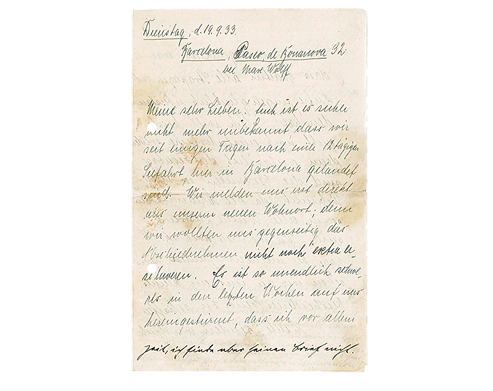 Meine sehr Lieben! Euch ist es sicher nicht mehr unbekannt, dass wir seit einigen Tagen, nach einer 12tägigen Seefahrt, hier in Barcelona gelandet sind. Wir melden uns erst direkt aus unserm neuen Wohnort; denn wir wollten uns gegenseitig das Abschiednehmen nicht noch extra erschweren. Es ist so unendlich schweres in den letzten Wochen auf uns hereingestürmt, dass ich vor allem zufrieden und glücklich war, dass Martin alle Strapazen und Aufregungen glücklich überstanden hat! – Ich will heute nicht noch ausführlicher werden, denn anlässlich der Feiertage sind die Gedanken so voller Wehmut, da die Allernächsten so in alle Winde zerstreut sind. Wir wohnen noch ck. [circa] 14 Tage bei meinem Bruder, dann sehen wir zu, uns ein kleines, bescheidenes Heim zu schaffen.
