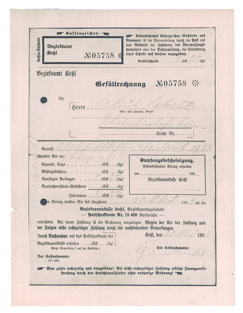 Dies entsprach dem üblichen Satz. Auch das Preußische Innenministerium war in einem Runderlass vom 4. April 1933 von dieser Summe ausgegangen: 20 Pfennige für die Morgenkost, 50 für das Mittagessen und 40 für die Abendverpflegung sowie 40 Pfennige für die Unterbringung. Bei einer siebentägigen Haft ergab dies 10,50 Reichsmark. Da das Bezirksamt Kehl über keinen entsprechenden Rechnungsvordruck verfügte, behalf sich der zuständige Beamte mit dem Formular für ein »Gefälle«, das heißt für eine zu entrichtende Gebühr. In die Rubrik für »Sonstige Auslagen« trug er eine Summe von 5,25 Reichsmark ein – denn er stellte nur den »1/2 Anteil« in Rechnung. Wer die andere Hälfte übernahm, ist unbekannt.