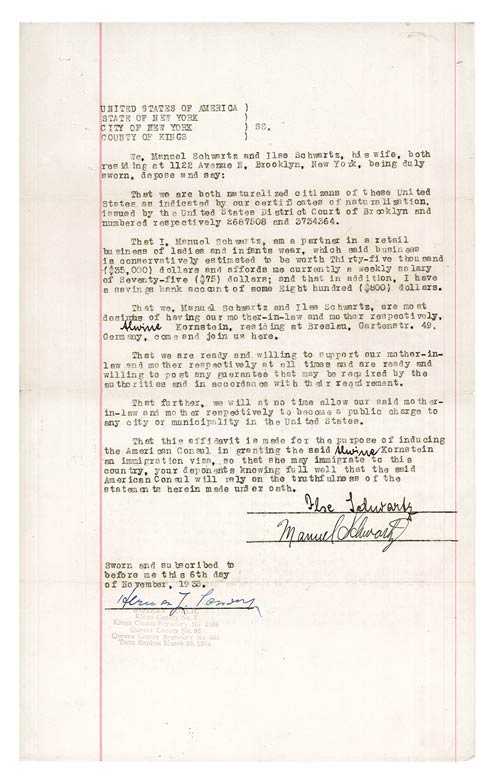 In order to immigrate to the United States these refugees required an affidavit of support. With it an American citizen personally pledged to look after an immigrant so that he or she would not become a burden to the state. The affidavit shown here was submitted by Manuel and Ilse Schwartz on 6 November 1933 on behalf of Ilse‘s mother, Alwine Kornstein, who lived in Breslau. In it Manuel Schwartz provided information about his work, income and savings. The couple, who lived in Brooklyn, also swore under oath that they were willing and able to support Alwine Kornstein at all times and guaranteed that she would not become a public charge to any city or municipality in the United States.