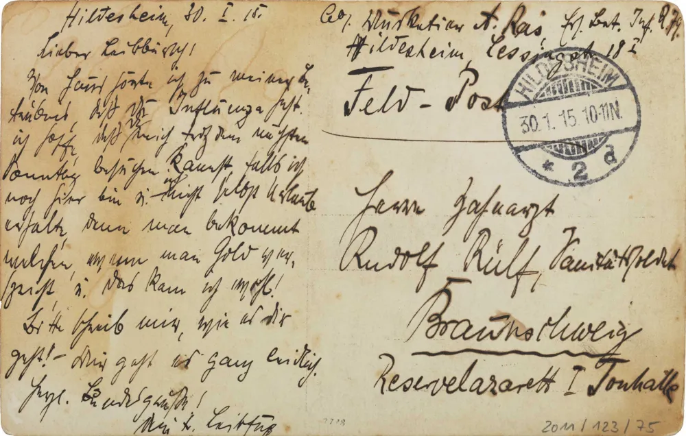 Alfred Reis volunteered for military service. In November, he was assigned to Infantry Regiment 79 in Hildesheim for basic training. Two post cards that he sent to Rudolf Rülf, who was then serving at a reservist military hospital, have survived.
