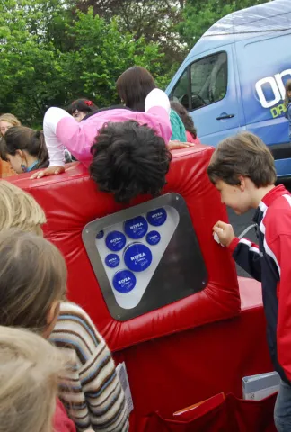 Sommertour 2007: Die mobile Ausstellung Discover JMB wird auf dem Schulhof aufgebaut. Juni 2007. Jüdisches Museum Berlin, Foto: Sönke Tollkühn